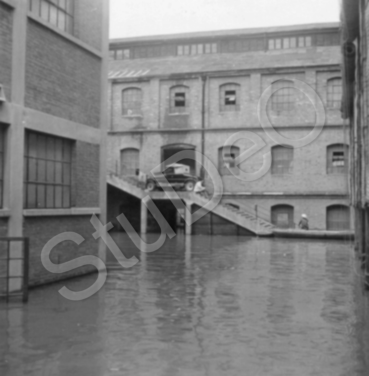 Beschreibung: Ein Auto wurde auf den Absatz einer Außentreppe abgestellt. Im Hof der Firma Carlowitz & Co.