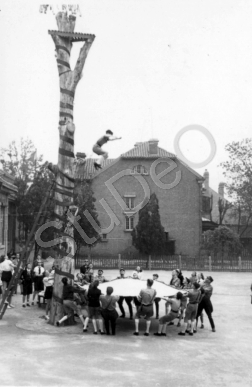 Beschreibung: Sport im Schulhof. Sprung vom Kletterbaum in ein Sprungtuch. Sportabteilung spannt das Sprungtuch. Der Kletterbaum ist der Stamm einer bei der Flut in 1939 eingegangenen Pappel.