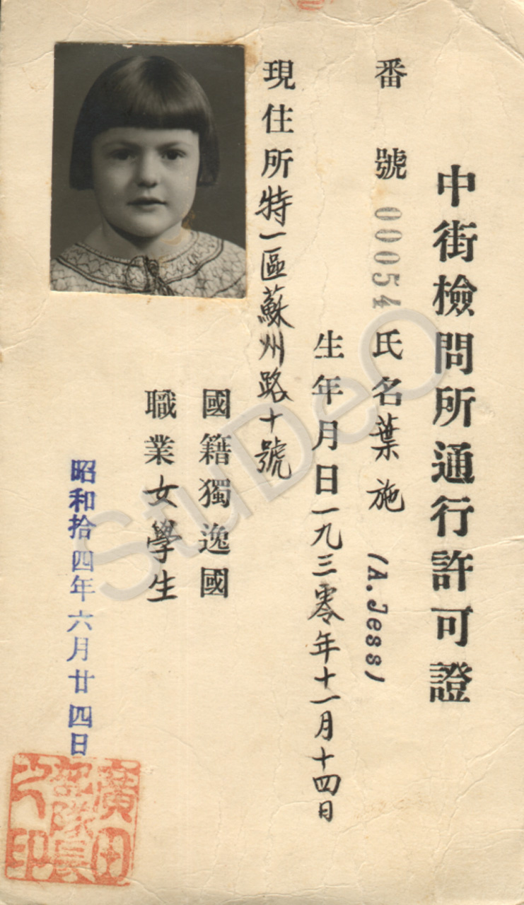 Beschreibung: Chinesischer (japanischer) Ausweis von Adelinde Jess als 10jährige für den Durchgang der japanischen Sperren um Tientsin. Mit Passbild.