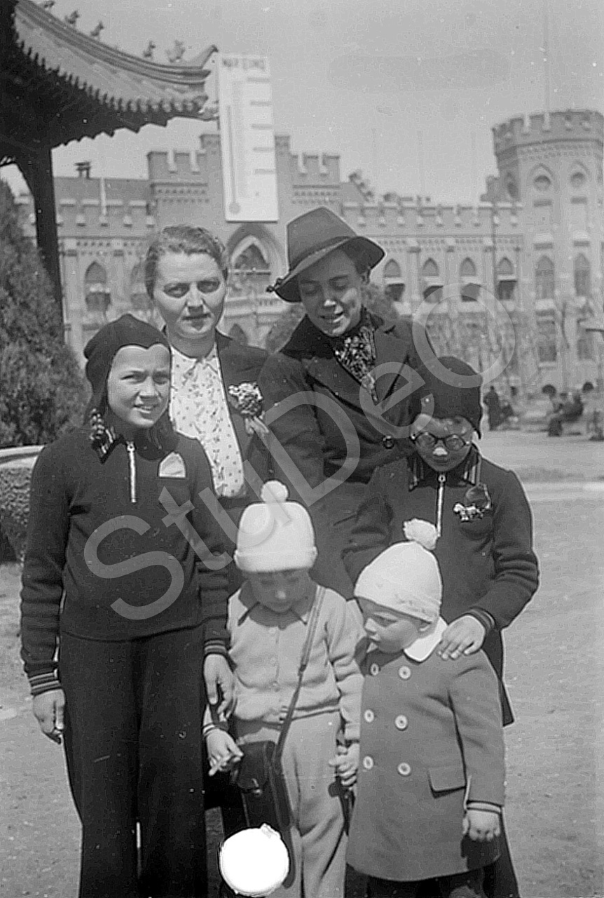 Beschreibung: Erna Deter (hinten li.), Herta Utech. Kinder v. li.: Gertrud Wetzel, Dieter Utech, H. Yü Deter und Albert Wetzel im Viktoria Park, im Hinter­grund der Gordon Hall. Ostern 1940.