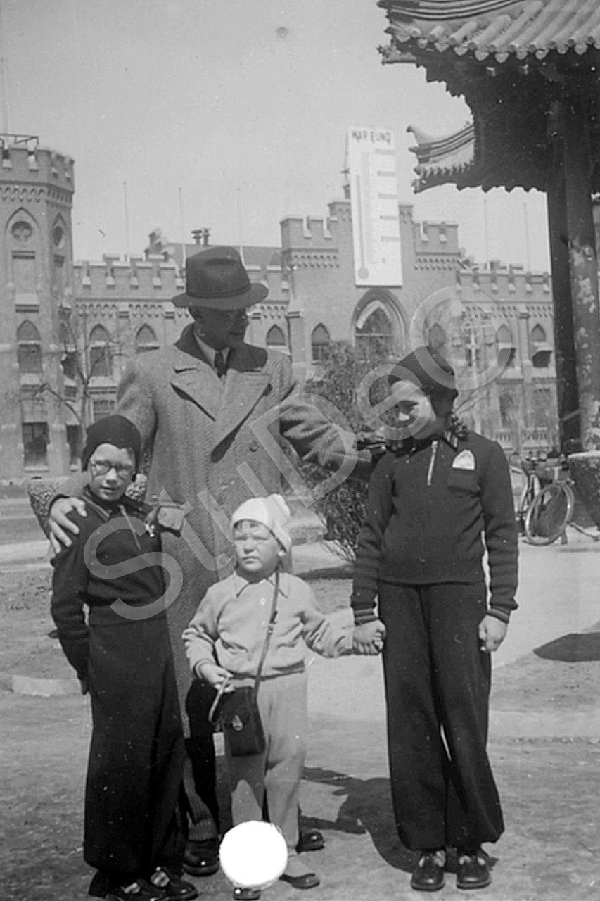 Beschreibung: Albert Ferdinand Wetzel. Kinder v. li.: Albert Wetzel, Dieter Utech und Gertrud Wetzel im Viktoria Park, im Hintergrund der Gordon Hall.