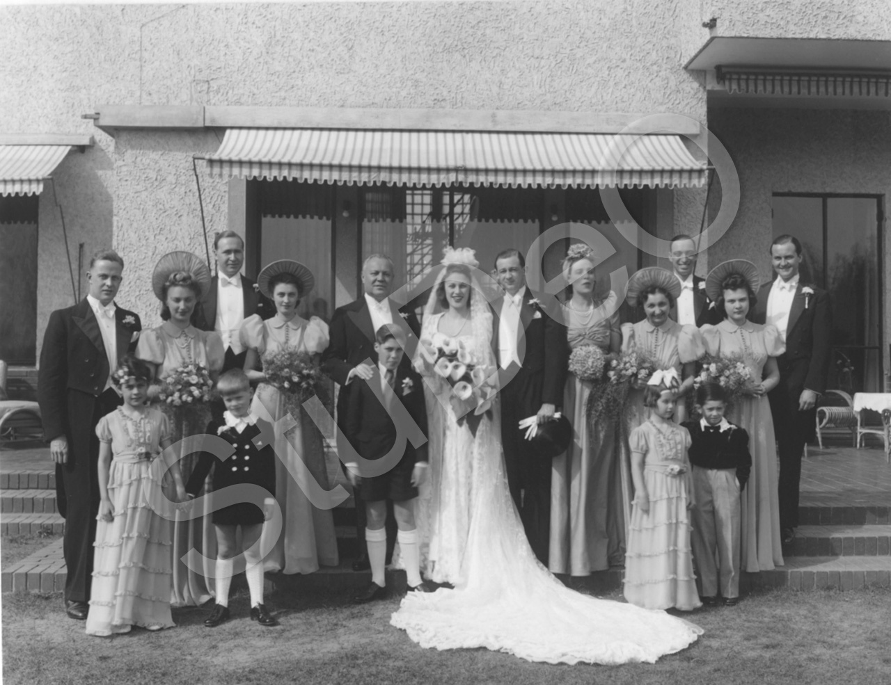 Beschreibung: Hochzeit von Wolfram Kohlmeyer und Gudrin Jannings, links vom Paar Werner Janning mit Sohn Mucki. Rechts Emma Jannings.
