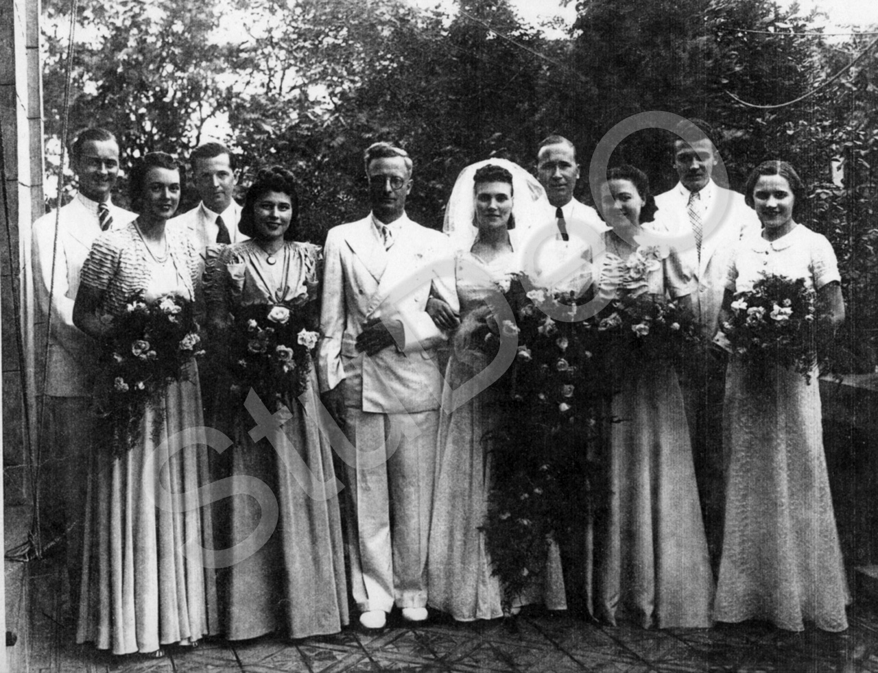 Beschreibung: Hochzeit von Oswald R. Hempel mit „Sunny“ Xenia/Oxana Kasputin. V.l. n.r. D.D. Will, Tanja Sajin, Lange, Rauza Ibragimoff-Bogard, rechts vom Brautpaar: Erich Lange, Masha Turkin. Lavdosky, ? Yana Vilimovitch.