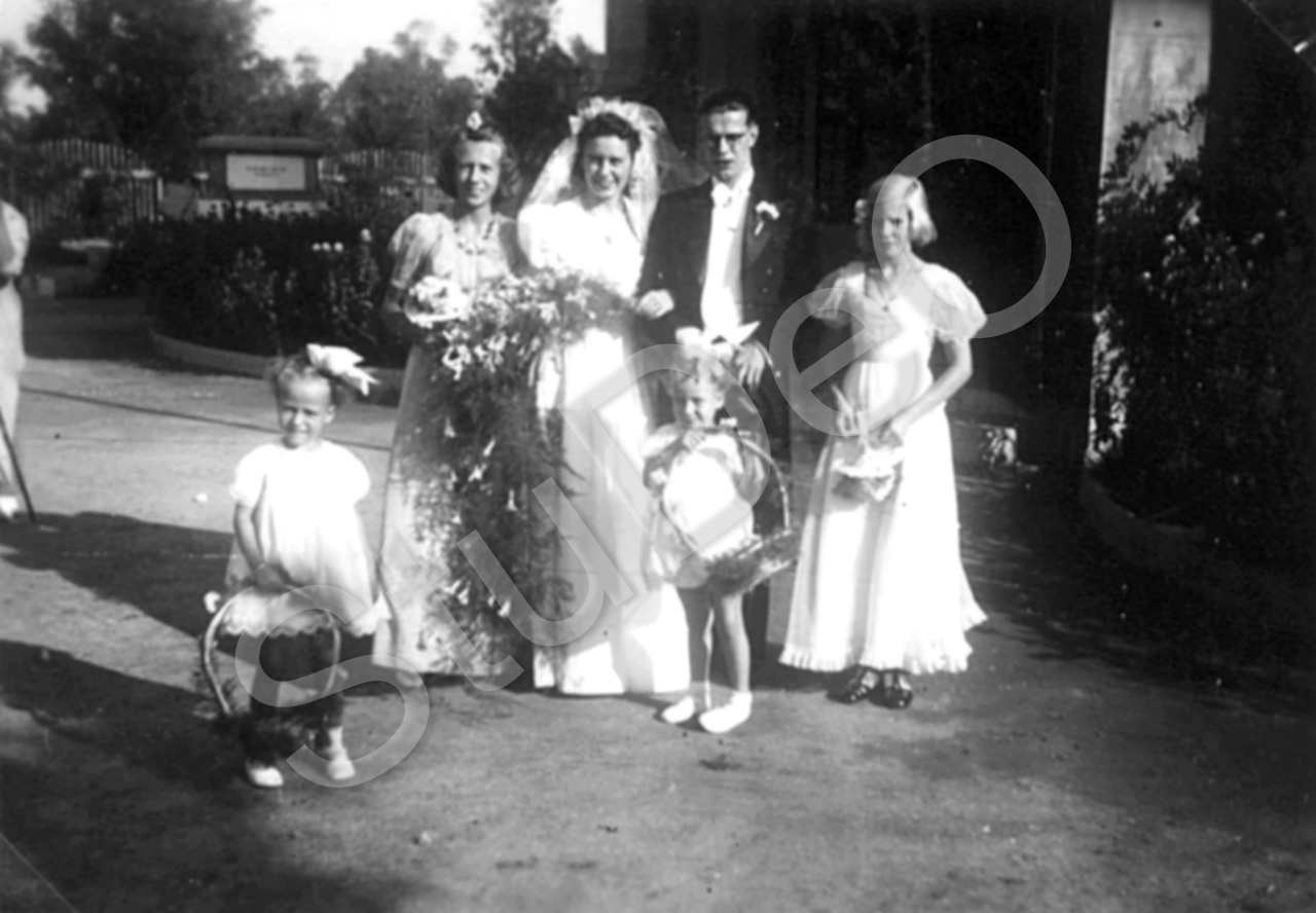 Beschreibung: Hochzeit Fritz Emme und Elvira Wormsbecher, Tientsin, Deutsche Kapelle, 27. September 1941. Das frisch getraute Paar mit den Brautjungfern Grete Marks und Marion Theuerkauf und den Blumenkindern Marks. Voraufgegangene standesamtlicheTrauung im Deutschen Generalkonsulat durch Kanzler Franz Marks.