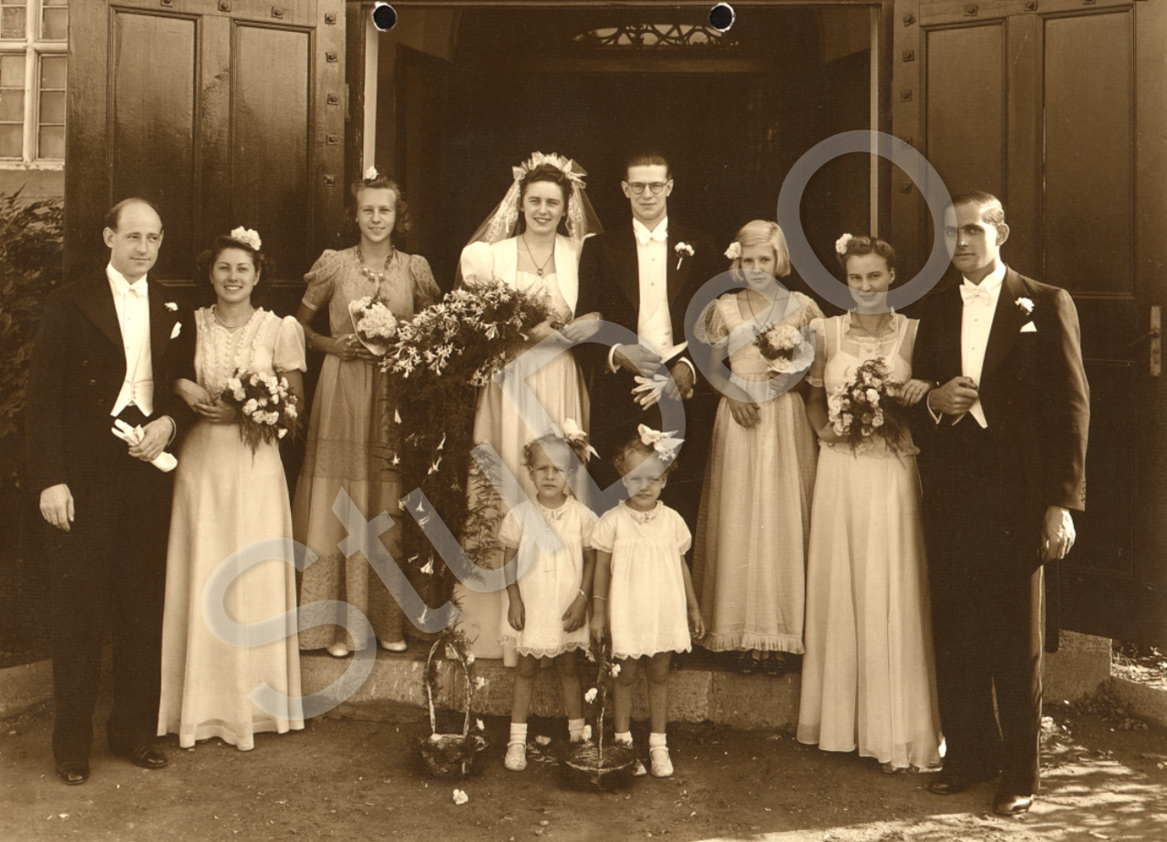 Beschreibung: Hochzeit Fritz Emme und Elvira Wormsbecher, Tientsin, Deutsche Kapelle, 27. September 1941. Hochzeitsgesellschaft vor der Kirchentür. Von Links: Trauzeuge J.G. Schütte, Vera Yakuscheff, Brautjungfern Grete Marks und Marion Theuerkauf, Tanja Sharaglasoff, Trauzeuge Siegfried Lohmann. Vorne die Zwillinge Marks, Blumenmädchen.