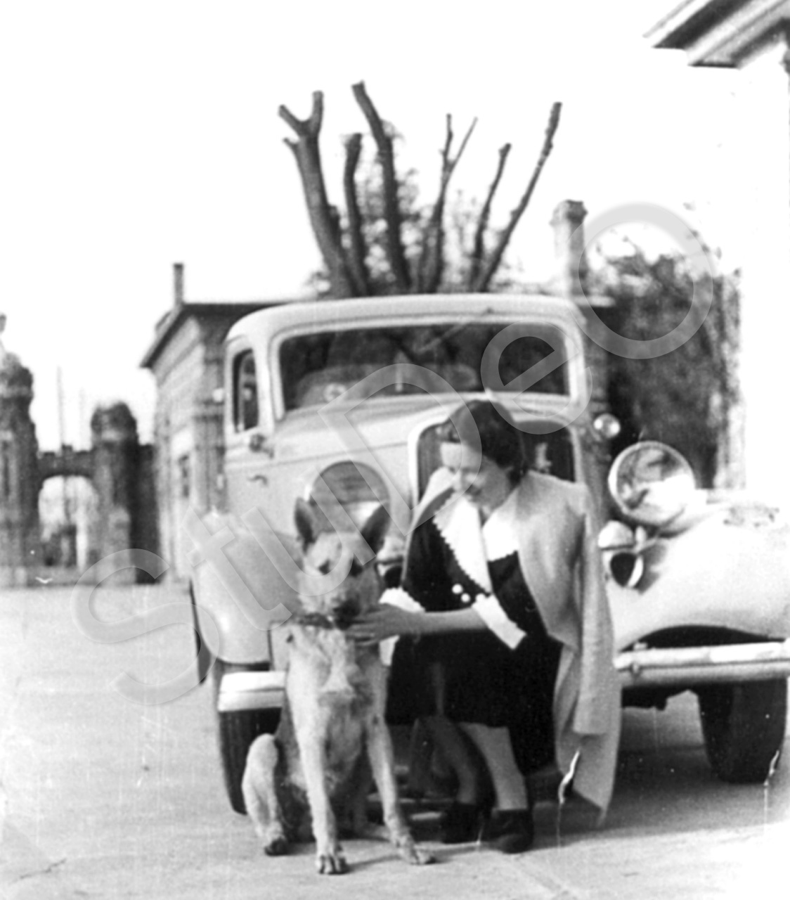 Beschreibung: Elvira Emme und Benno Papes Auto (ein heller Ford) im Frühjahr 1942 vor Melchers Messe.
