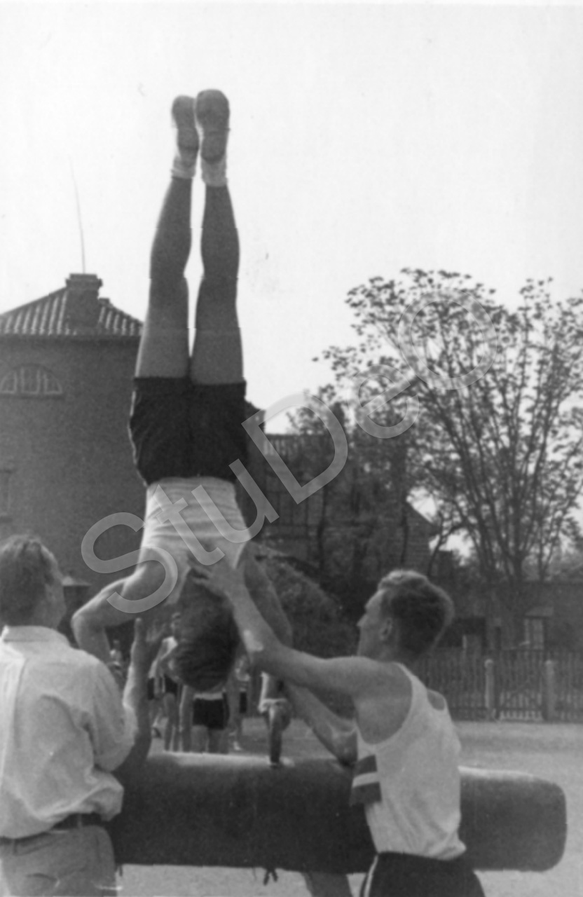 Beschreibung: Vorführung im Schulhof. Überschlag am Querpferd. Hilfestellung: Wolfgang Müller und Heino Hackmack