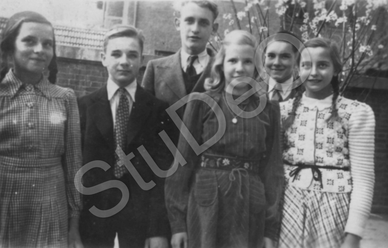 Beschreibung: Schüler der Dt. Schule Tientsin, v.l.n.r. Waltraud Glas, Horst Rosatzin, Karl Emmo Vissering, Marion Theuerkauf, Ludwig Glas, Inka Vissering.