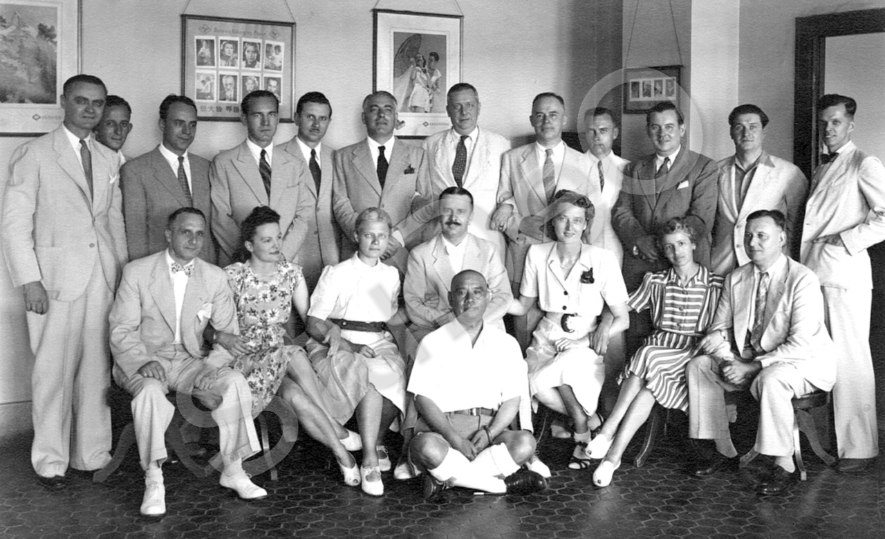 Beschreibung: Zum 25 Jubiläum von Carl G.J. Schwender in der Defag Tientsin. Stehen­de Reihe v.li. Bazeos?, ?, Frosch, W. Wicke, Zumfelde, Pedaschenko, Dr. L. May?, Felix Hesse, Walter. Sitzend v.li. Roll, Inge Breuer, Hilde Kapper, Carl Schwender, davor ?, Olga Kleemann, Eva Mock, P. Fritz.