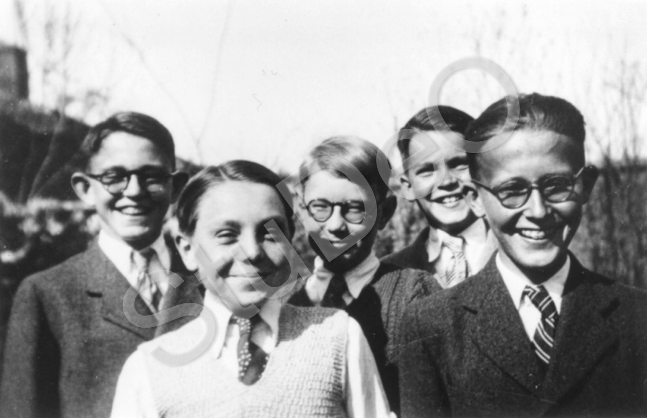 Beschreibung: Schüler der Deutschen Schule Tientsin, v.li Hernabb Saefkow (3. Kl.), Edgar Arnhold (4.Kl.), AlbertWetzel (3. Kl.), Rudi von Raumer (3.Kl.) und Hans Jürgen Schulze (2.Kl.) Schuljahr 1944/45.