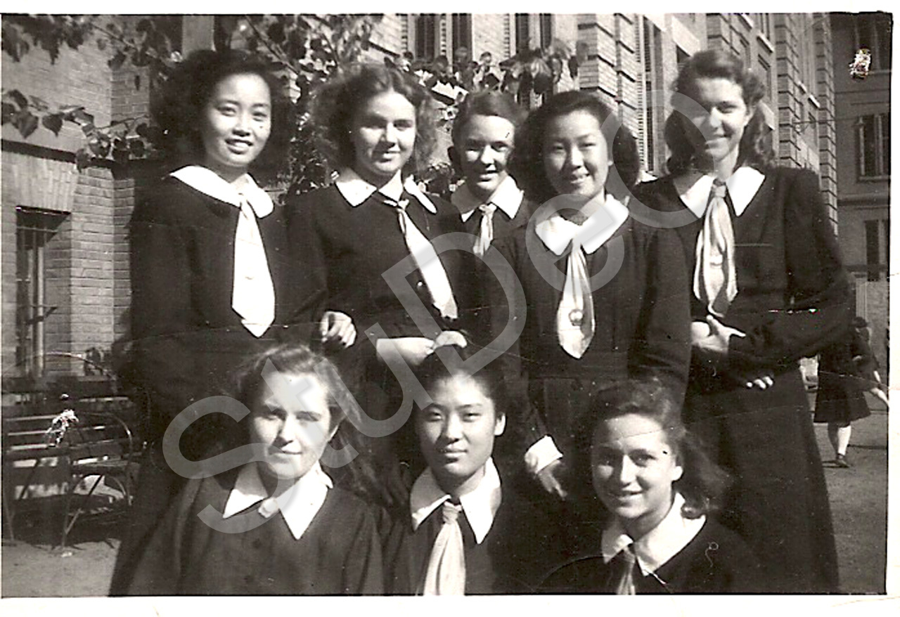 Beschreibung: Schülerinnen der Sankt Josephs Schule, die Klasse von Renate Puck, die Abiturs-Klasse 1948/48. Stehend v.li. Jessie Ma, Renate Puck, Ruth Yuan, Milla Liu Lin, Vera Stab, Genevieve Hu, Alla Stepanoff.