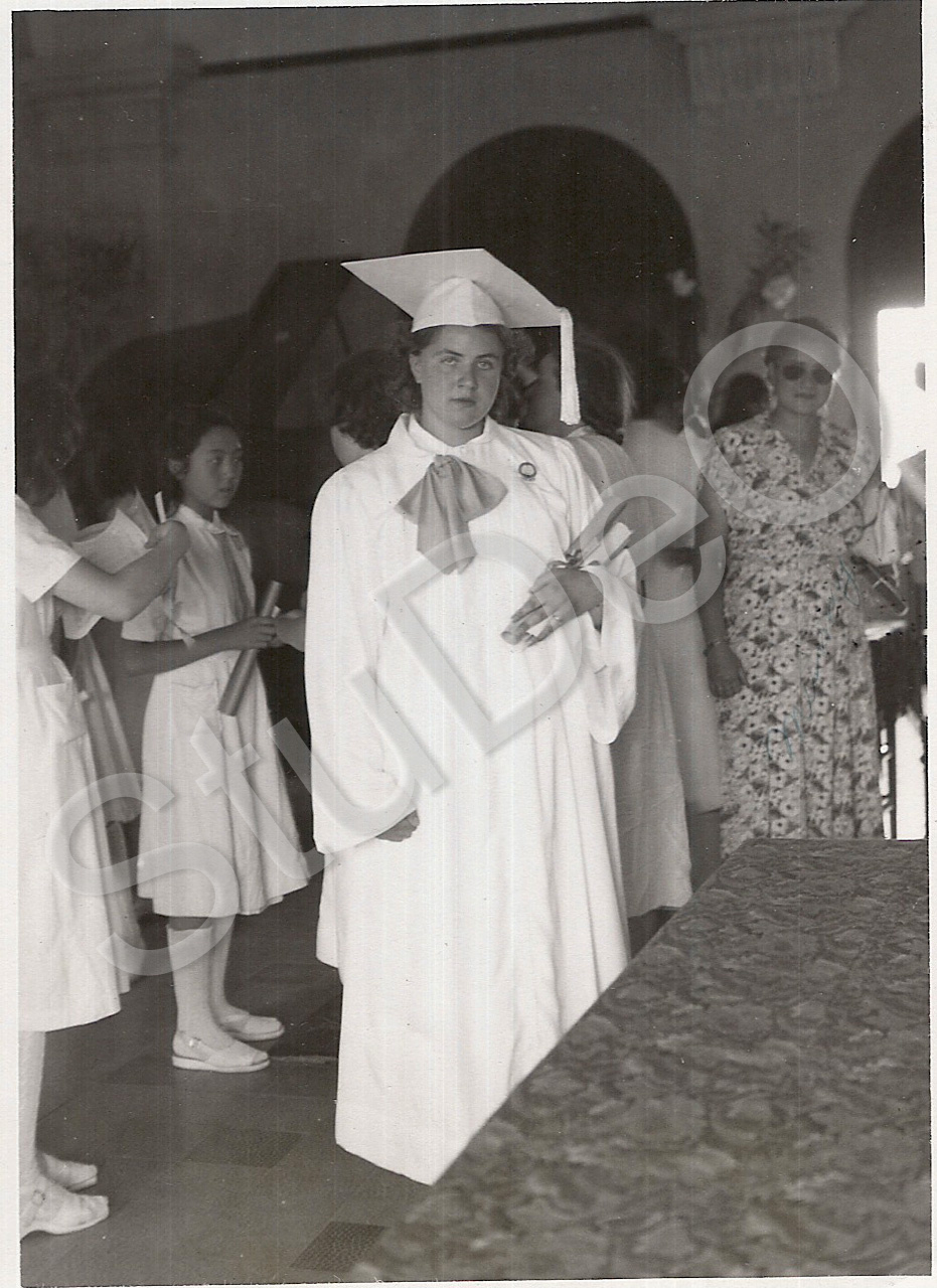 Beschreibung: Renate Puck mit Barret als Abiturgraduierte in der Sankt Josephs Schule.