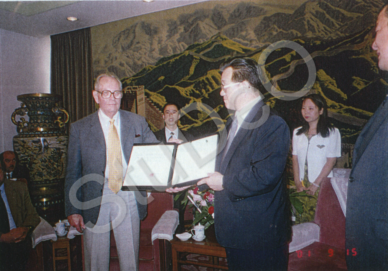 Beschreibung: Dr. Werner Kiessling erhält die Urkunde als Ehrenbürger von Tientsin als Sohn des ersten Deutschen Konditors in Ti. Die Konditorei „Kiessling und Bader“ („Chiseling“) wird von den Chinesen bis heute weitergeführt.