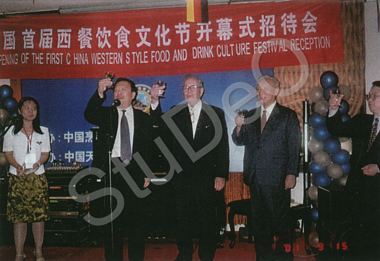 Beschreibung: Dr. Werner Kiessling  bei der Eröffnung des Spruchbandes für die 100-Jahresfeier von Kiessling (und Bader) unter dem Motto „Opening of the first China western style Food and Drink curlture Festival reception“.
