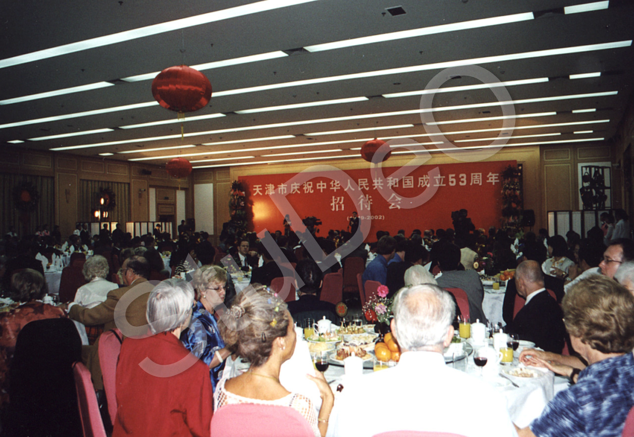 Beschreibung: Feier zum Nationalfeiertag in Tianjin 2002. Am Tisch von links Heidi Meske, Renate Jährling, Angela u. Tom Elliot (vorne), rechts Christl Hickman und hinten Horst Rosatzin.