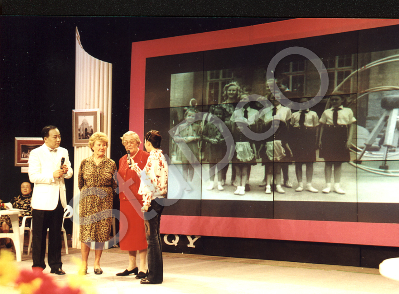 Beschreibung: Auf die Bühne im Studio des Fernsehsenders Tianjin. Zwillinge Christl  Hikman und Eva Bodenstein.  Hinter ihnen ist ein Foto von ca. 1942 mit den 6 Tien­tsiner Zwil­lingen auf eine Lein­wand projiziert. Unter den etwa 110 Kindern der Dt. Schule (damals) gab es 6 Zwillings­schwes­tern. Das Foto zeigt oben die ältesten, Christl und Eva Skoff, mit den jüngsten, El­friede und Hedi Tritthart, auf dem Arm, ferner Annie und Sophie Schwen­der, Gerda und Ingeborg Lück, Natalie und Gabriele Gross, Karin und Sigrid Marks.