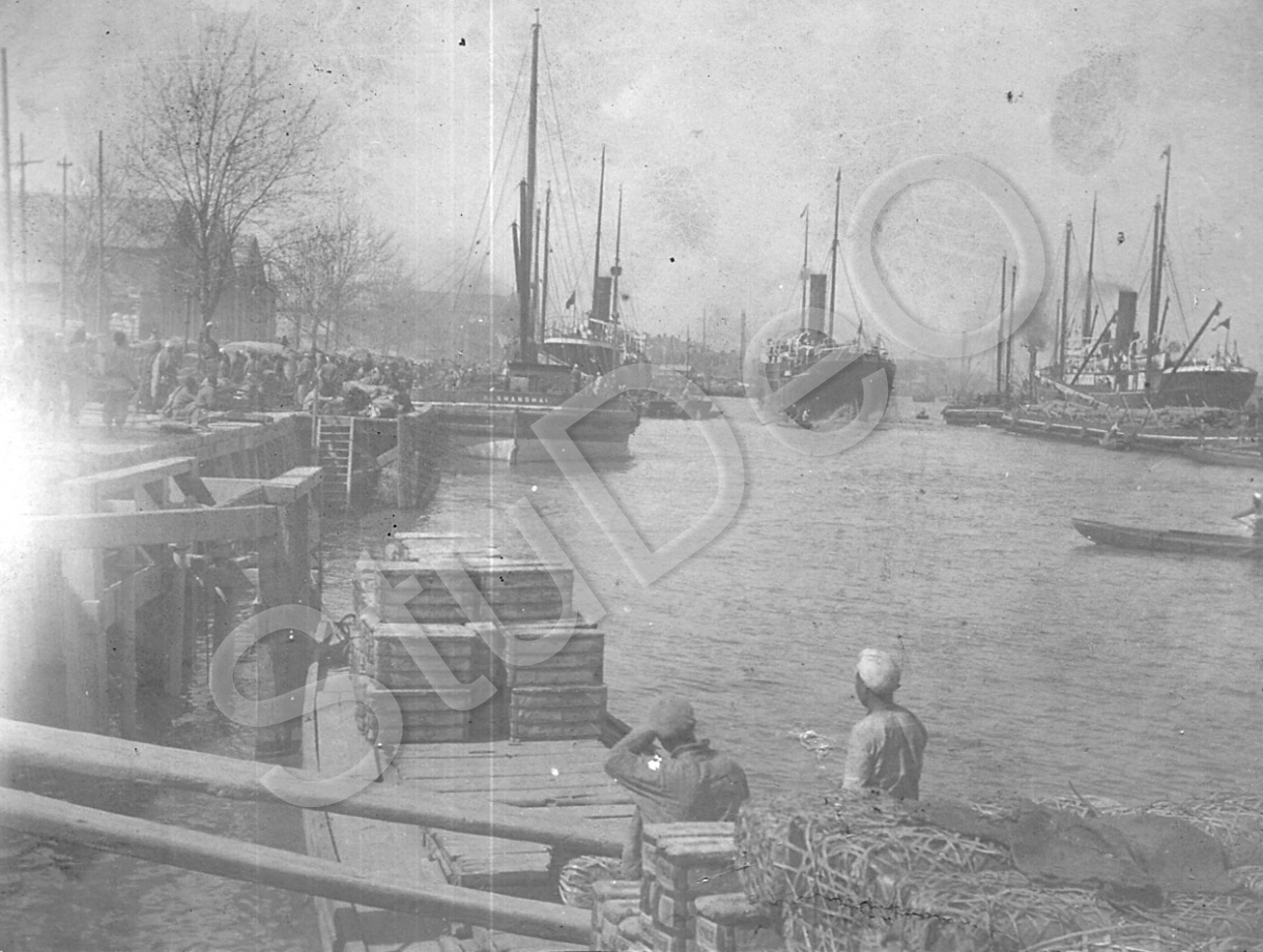 Beschreibung: Hafen Tientsin? Dampfer und Löschrbeiten.
