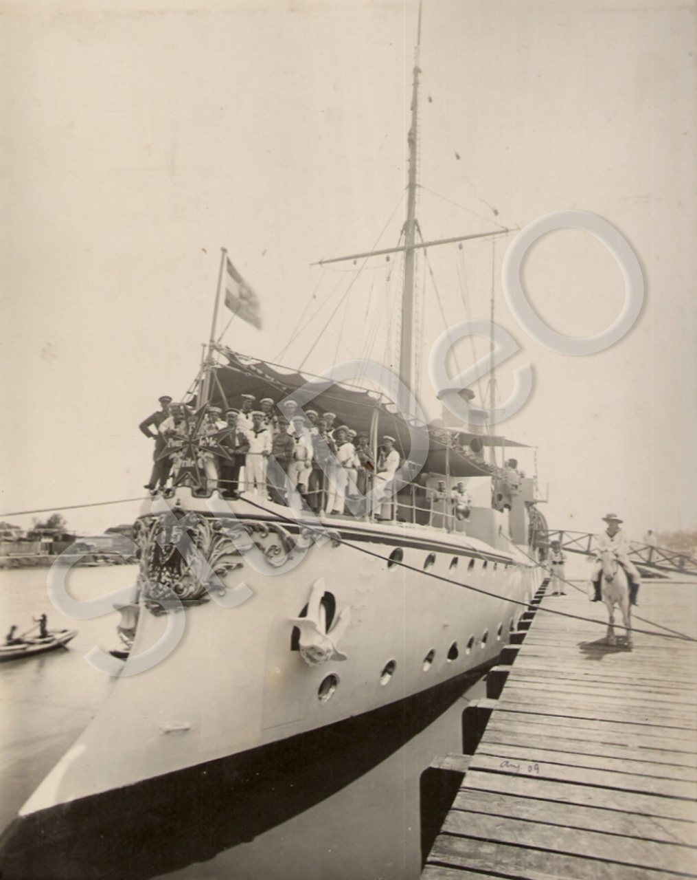 Beschreibung: Truppentransportdamfer im Hafen mit dem preußischen Kriegsorden „pour le meri­te » für Verdienste vor dem Feinde. Besatzung Österreicher?
