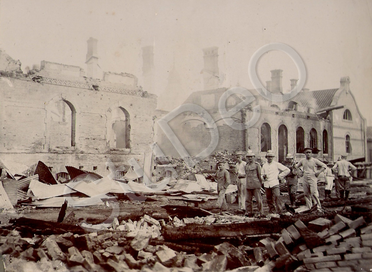 Beschreibung: Vermutlich ein Militärgebäude, wie Munitions- u. Waffenlager, das Explodiert oder anderweitig zerstört wurde. Soldaten intern Truppen.