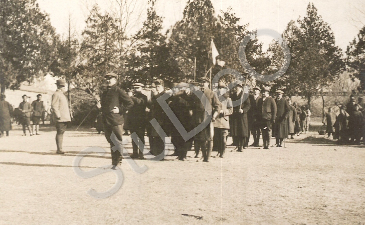 Beschreibung: Herren marschieren mit Fahnen (Reiterverein?).