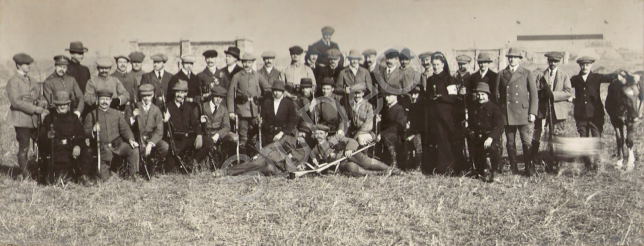 Beschreibung: Eine Jagdgesellschaft hat sich zum Fotografieren gruppiert.