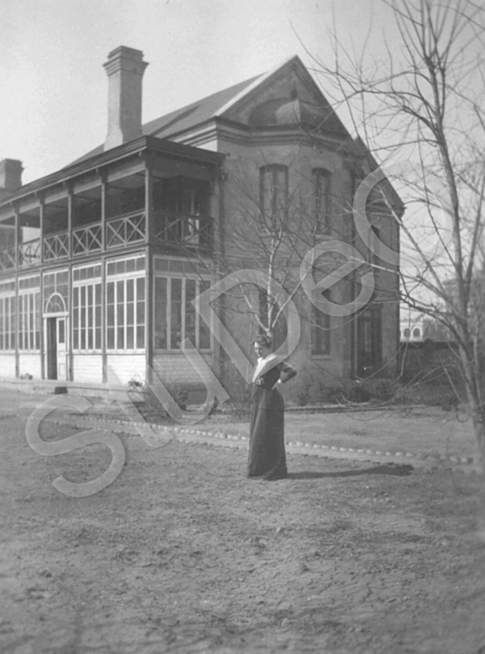 Beschreibung:  Frau Balser vor ihrem Haus in der Council Road 1914-1915. „Geburtshaus von Karli u. Helmut“.