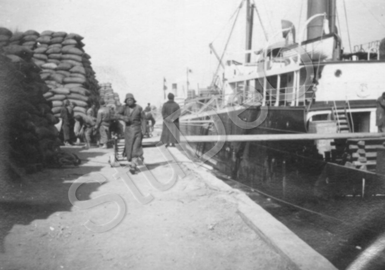 Beschreibung: “Am Peiho-Fluß”. Betrieb am Hafen. Kohlesäcke, Schiffe.