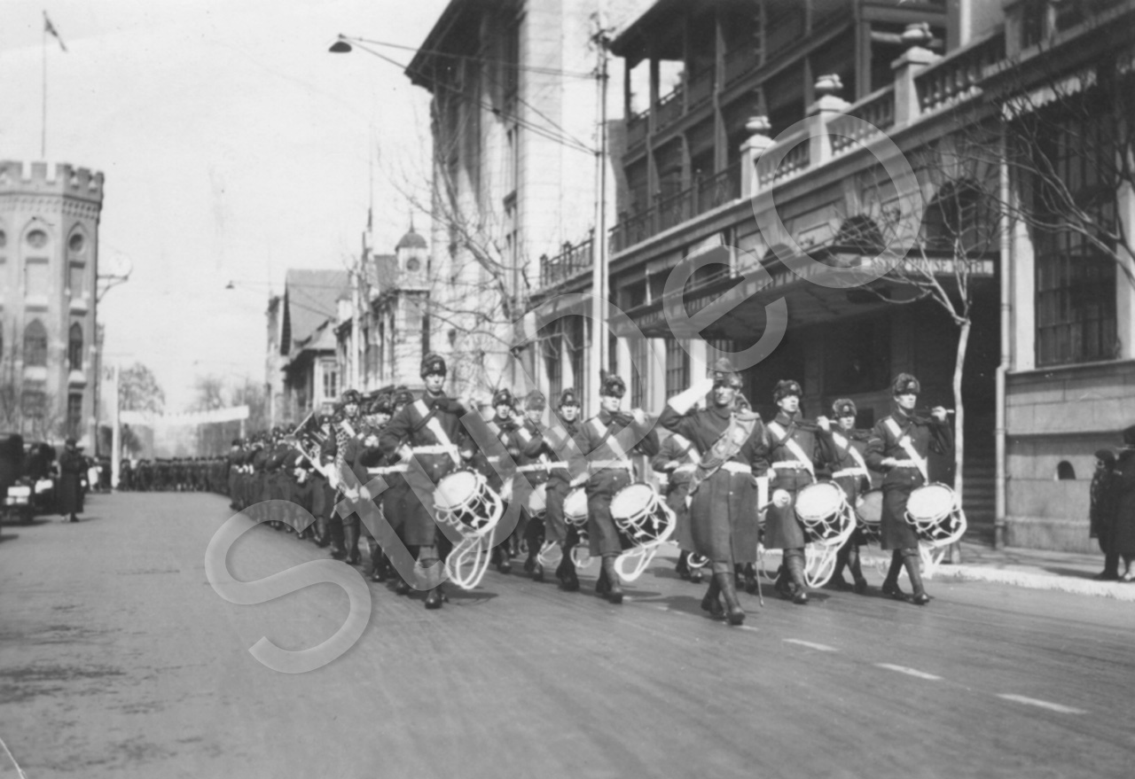 Beschreibung: Militärische Musikkapelle entlang der Victoria Road auf der Höhe des Victoria Parks. Links ein Turm der Gordon Hall. Rechts Hotel Astorhaus.
