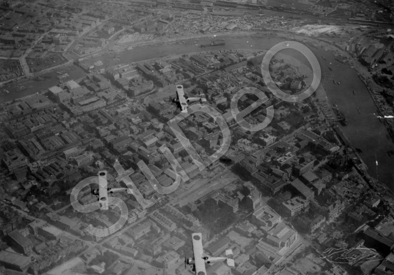 Beschreibung: Flugzeuge fliegen über dem Gebiet der französischen Konzession. Quai de France = frz. Bund am Hai Ho. Von unten rechts kommend die Rue de France (als Fortsetzung der Viktoria Road), die an der Internationalen Brücke, die zur russischen Konzessin führt, mündet. Rechts oben Bahn­hof.