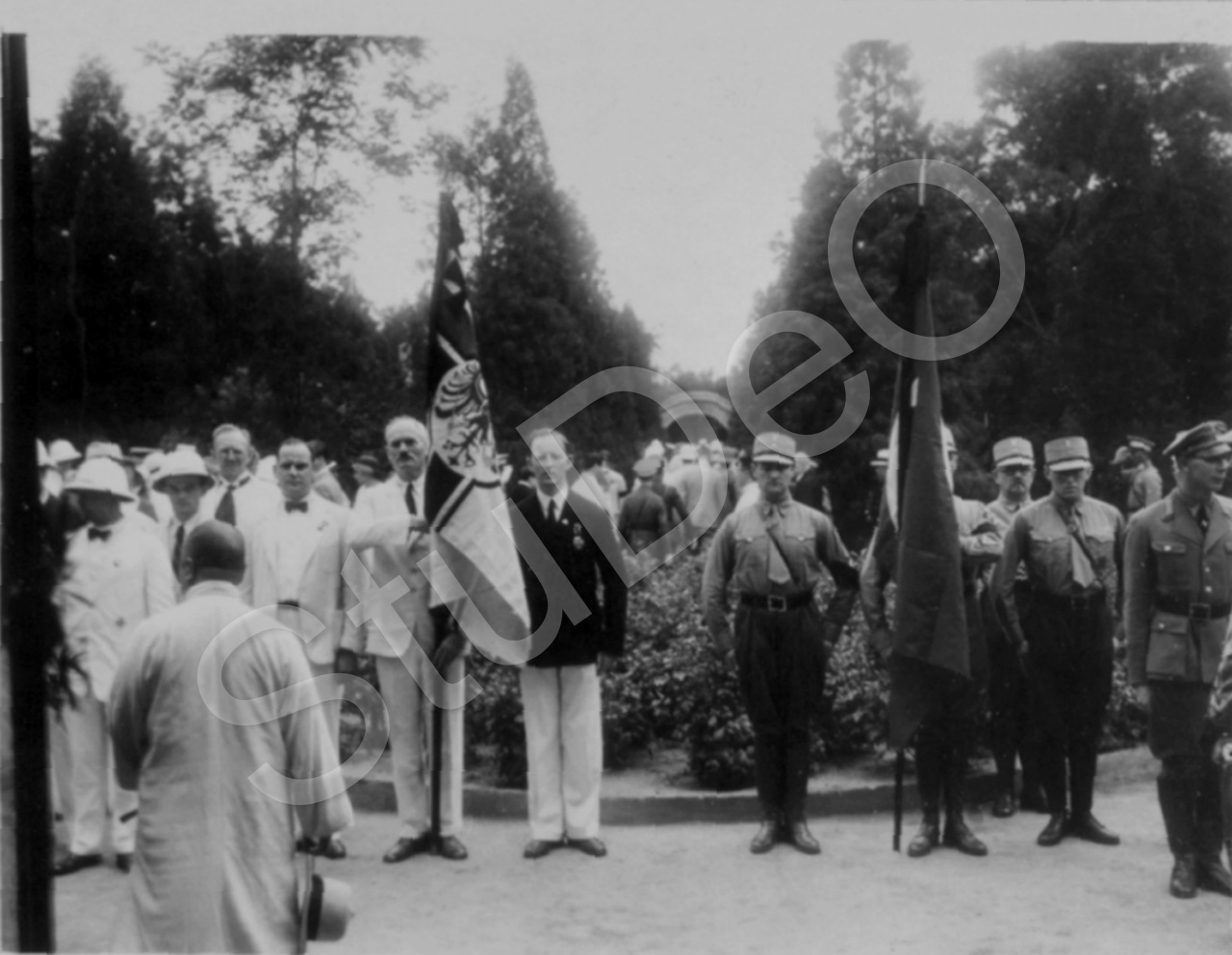 Beschreibung: „Stahlhelm oder Bund der Frontsoldaten“ Ortsgruppe Tientsin. Pfarrer Puffert, Arthur G. Lisske, Walter Mucks (Fahnenträger), Jensen, u.a.