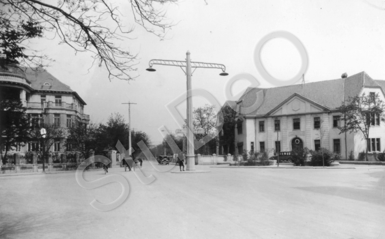 Beschreibung: Deutsches Generalkonsulat (rechts) als Gesamtbild. Oben Inschrift Re­lief: „Deutsches General­konsulat“, darunter im Kreis der „Adler“. An­stel­le der Straßenlampe stand in der Straßenkreuzung Woodrow Wilson- Bureau Street 1900 bis 1919 das Kriegerdenkmal, „der Roland“ genannt.
