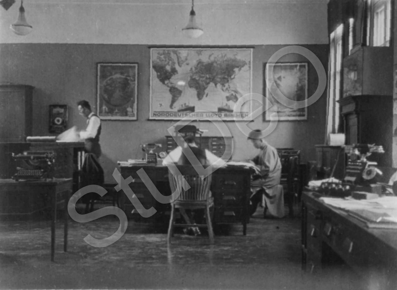 Beschreibung: Büro der Firma Melchers & Co. An der Wand hängend eine Weltkarte vom Norddeutschen Lloyd Bremen.