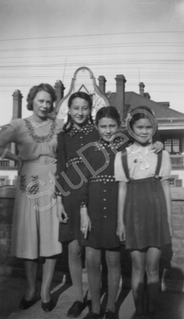 Beschreibung: Auf dem Dachgeschoß des Ribana-Hauses in der Woodro WilsonStr. 36 stehen von L.n.r.: ?, Lotti und Helga Krippendorf, Monica Wolf. In dem Geschoß wohnte Hedwig Oertel (Miederwaren).