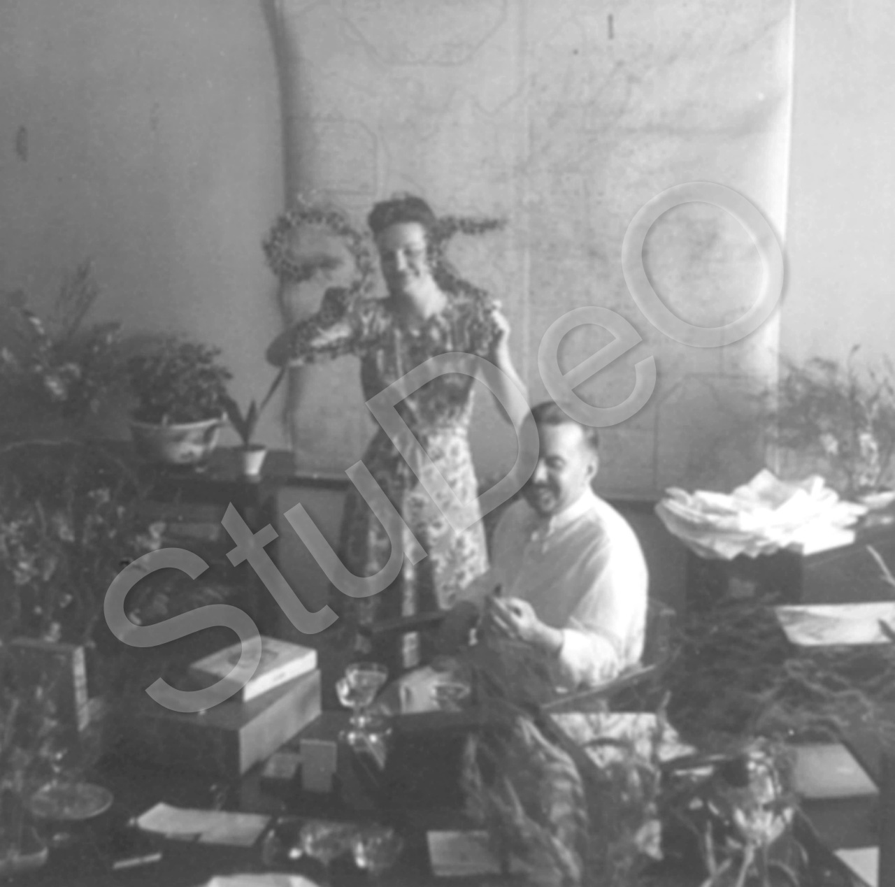 Beschreibung: Carl G.J. Schwender, Geschäftführer der Deutschen Farben-Handels-ge­sellschaft Waibel & Co. (DEFAG) in Tientsin packt seine Gehschenke zum 25. Dienstjubiläum in der Firma aus. Stehend Inge Breuer.