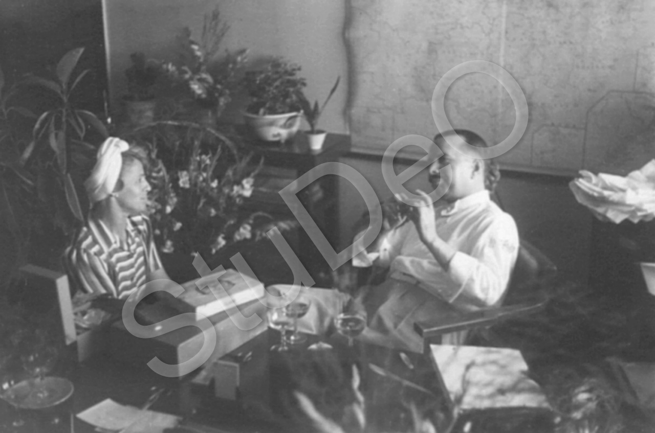 Beschreibung: Carl G.J. Schwender, Geschäftführer der Deutschen Farben-Handels-ge­sellschaft Waibel & Co. (DEFAG) in Tientsin packt seine Gehschenke zum 25. Dienstjubiläum in der Firma aus. Eva Mock sitz dabei.