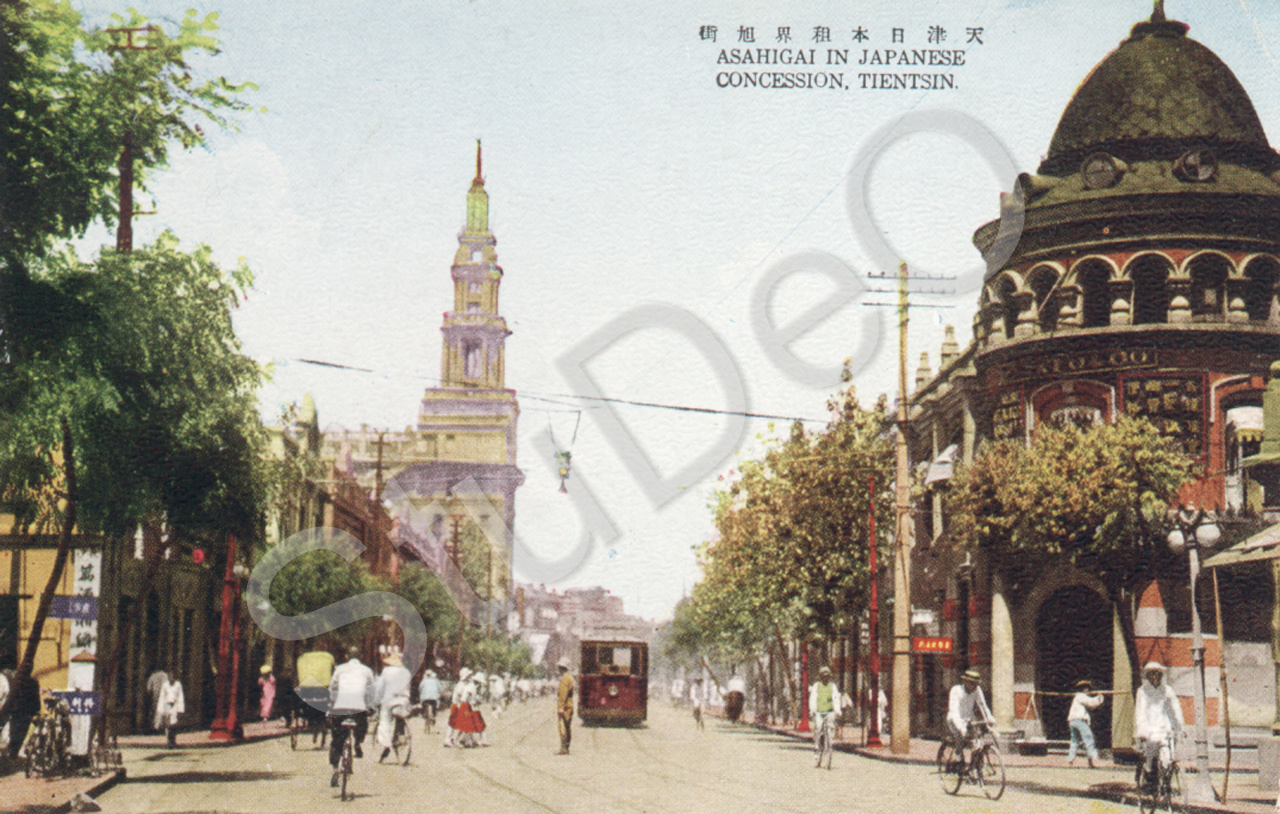 Beschreibung: Asahi-Straße mit Straßenbahnlinie in der Japanischen Konzession. Links Union Hospital?