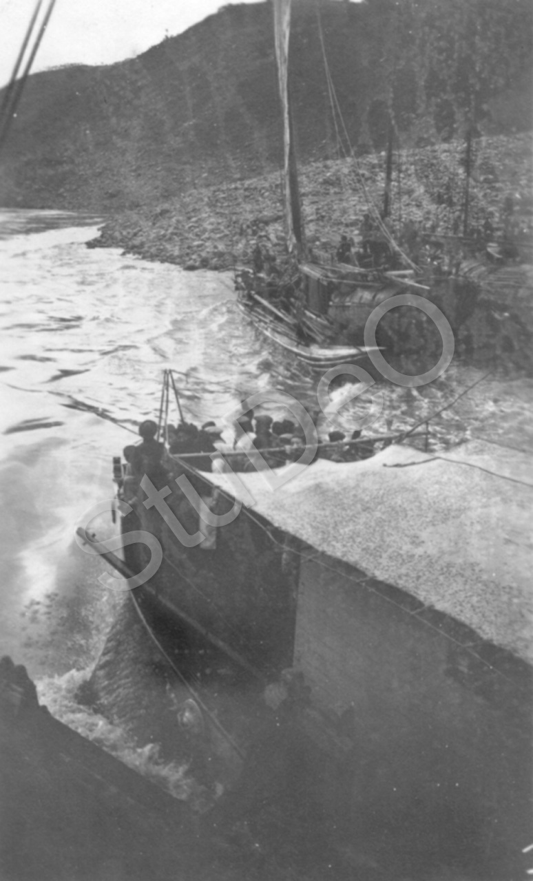Beschreibung: Voll besetzte Dschunken am Ufer von Chungking (neu Chongqing).