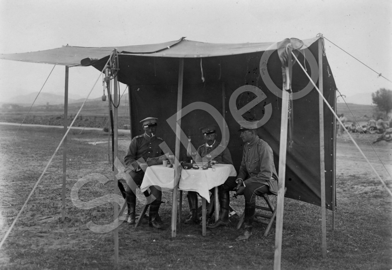Beschreibung: (v.li.n.re.) Oberleutnant Paul Bärensprung , Hauptmann Schering und Leutnant Behrens des III. Seebataillon, 1. Kompanie, im Biwak bei Litsun.