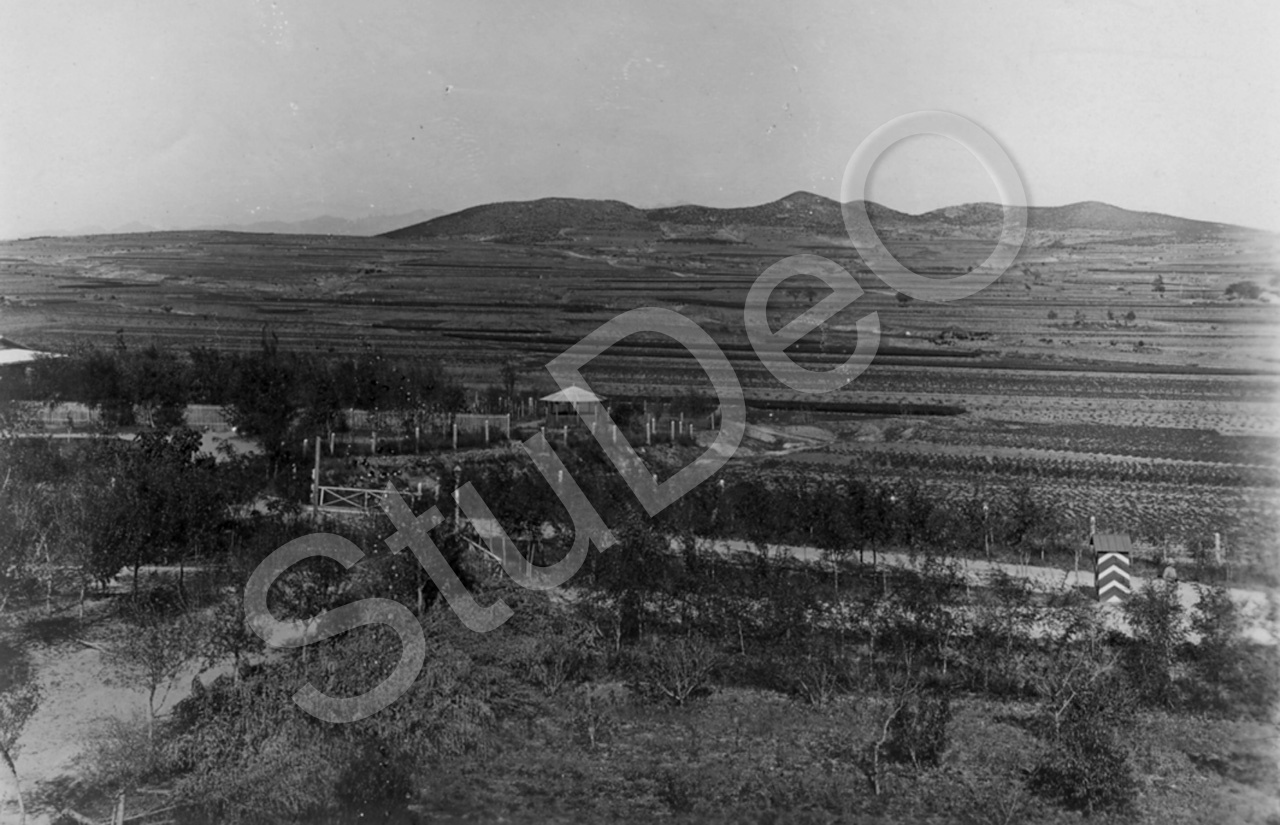Beschreibung: Offiziersmesse Syfang. Panorama vom Wasserturm. 1. im Hintergrund der „Ta shan“. 2. im Vordergrund „Offizierslager“.