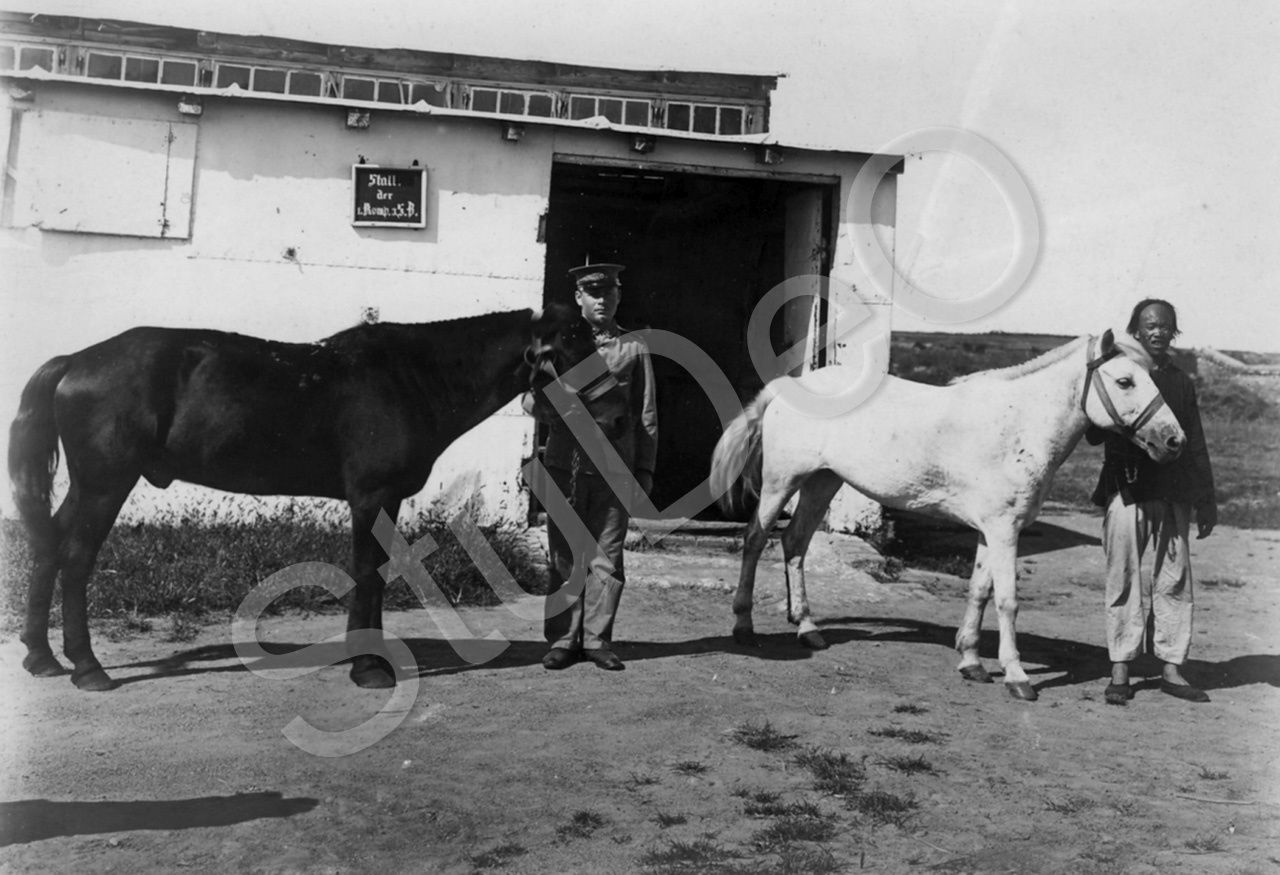 Beschreibung: Ponys von Oberleutnant Paul Bärensprung: li. Pferd Hans mit Burschen Neef. Re. Schneeittchen mit Mafu (Pferdehalter) Moritz, alles vor dem „Stall der 1. Kompanie, III Seebataillon.