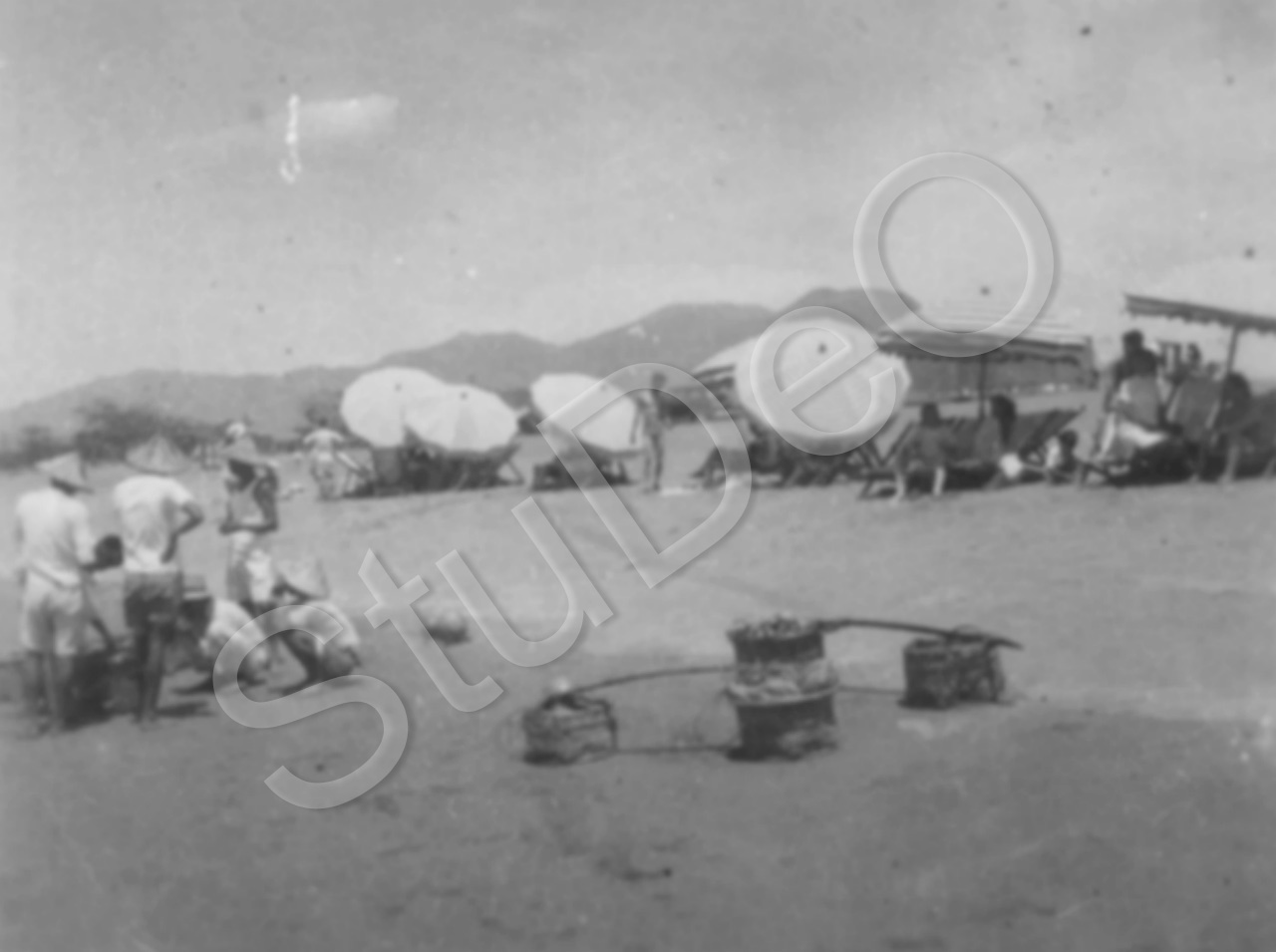 Beschreibung: Strandleben in Tam Shui. Obstverkäufer und ihre Körbe. In den Bergen hinten liegt Tsao Shan/Tainan.