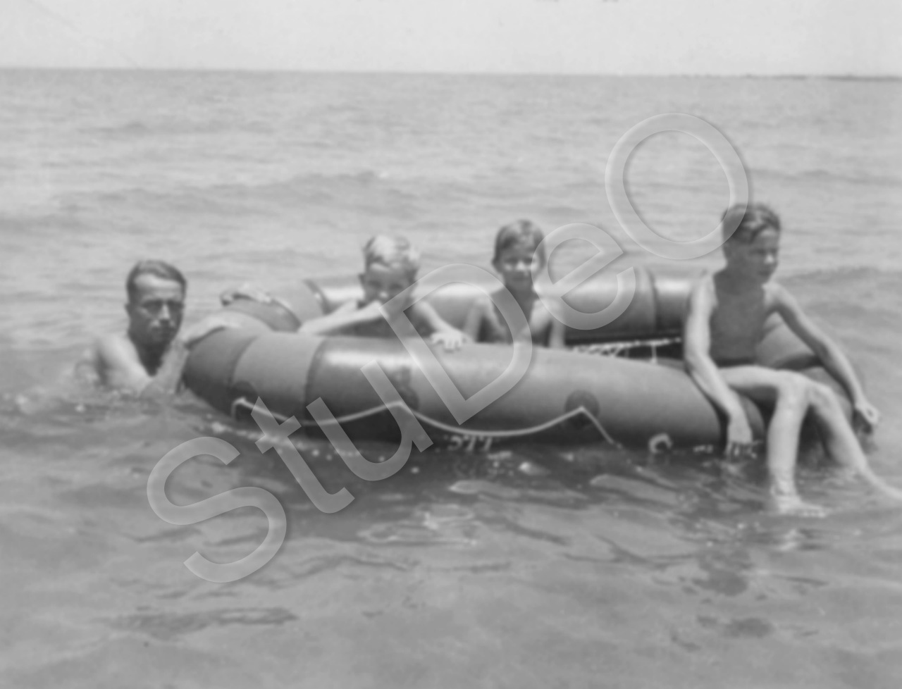 Beschreibung: Otto Günther und seine Kinder Horst, Anita u. Wolfgang im Gummiboot in Tam Shui, Seebad in NW von Taiwan.