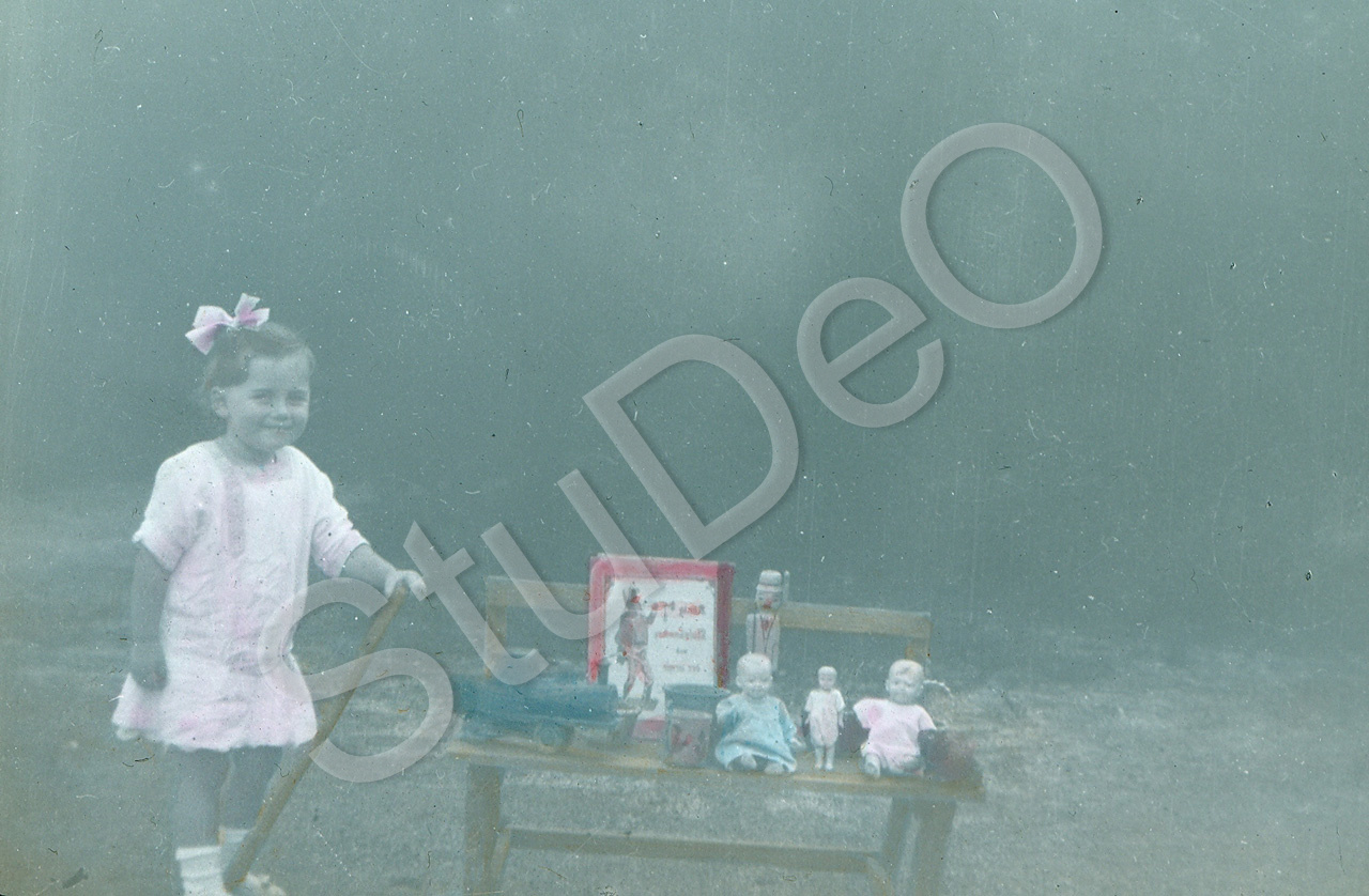 Beschreibung: Rose Lenz, 5 Jahre alt, mit ihren Geburtstagsgeschenken. Ihr Geburtstag wurde am Tauftag gefeiert, da sie an einem 29.Dezember geboren wurde.