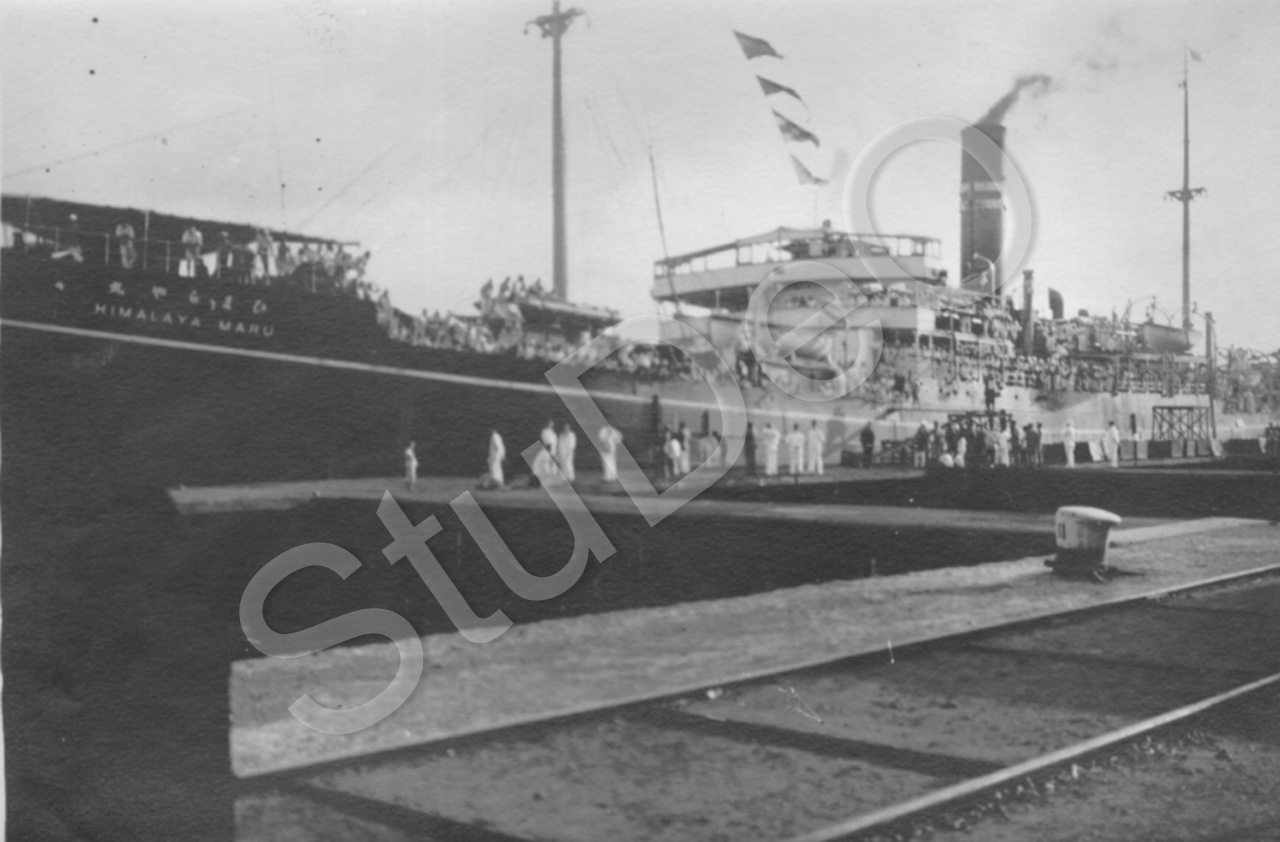 Beschreibung: Deutsche Kriegsgefangene aus Japan werden mit der Himalaya Maru nach Deutschland zurückgebracht, Abfahrt aus Kobe Hafen.
