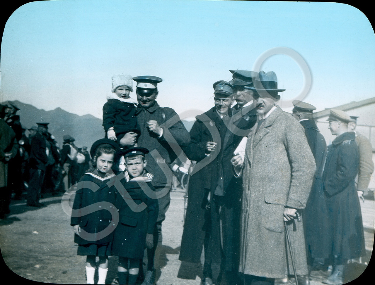 Beschreibung: Deutsche Kriegsgefangene (Tsingtaukämpfer) nahmen in Kobe am Schiffs Peer Abschied vor ihrer Rückreise nach Deutschland, nach 5-jähriger Gefangenschaft in verschie­denen japanischen Lagern. Rose vorne links, Günter Lenz auf dem Arm.
