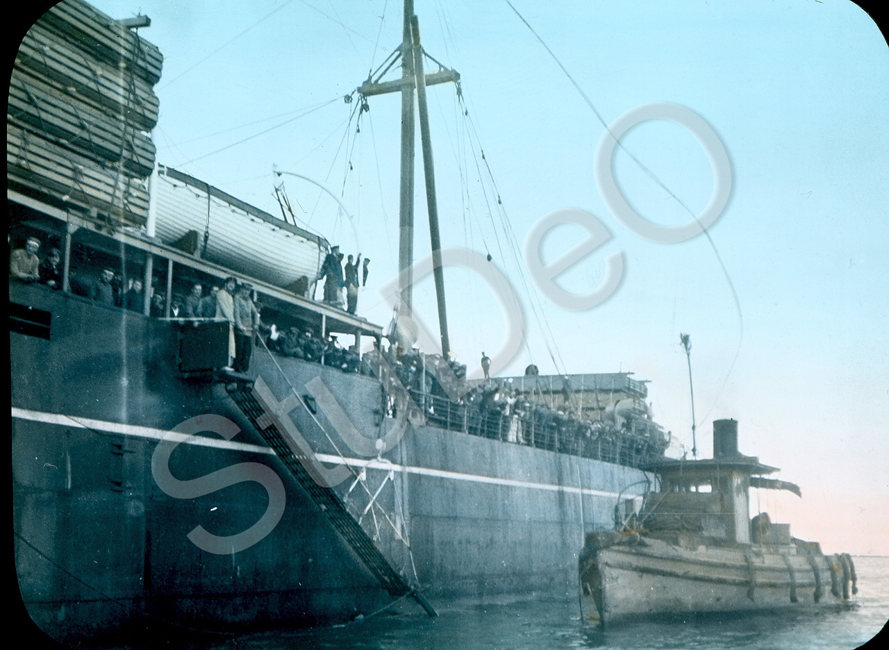 Beschreibung: Ausreise (per Dampfer) der deutschen Kriegsgefangenen (Tsingtau­kämp­fer)aus Kobe. Nach 5-jähriger Gefangenschaft in verschie­denen japani­schen Lagern wieder nach Deutschland.