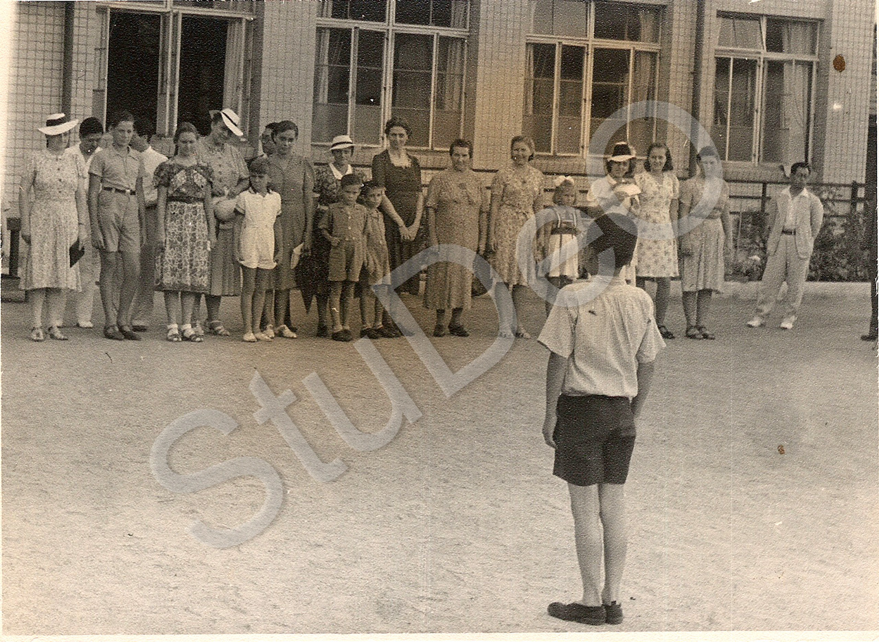 Beschreibung: Mütter und Lehrer? als Zuschauer vor der Schule in Kobe. Kinder führen etwas vor, Eva Müller (7. v. re.).