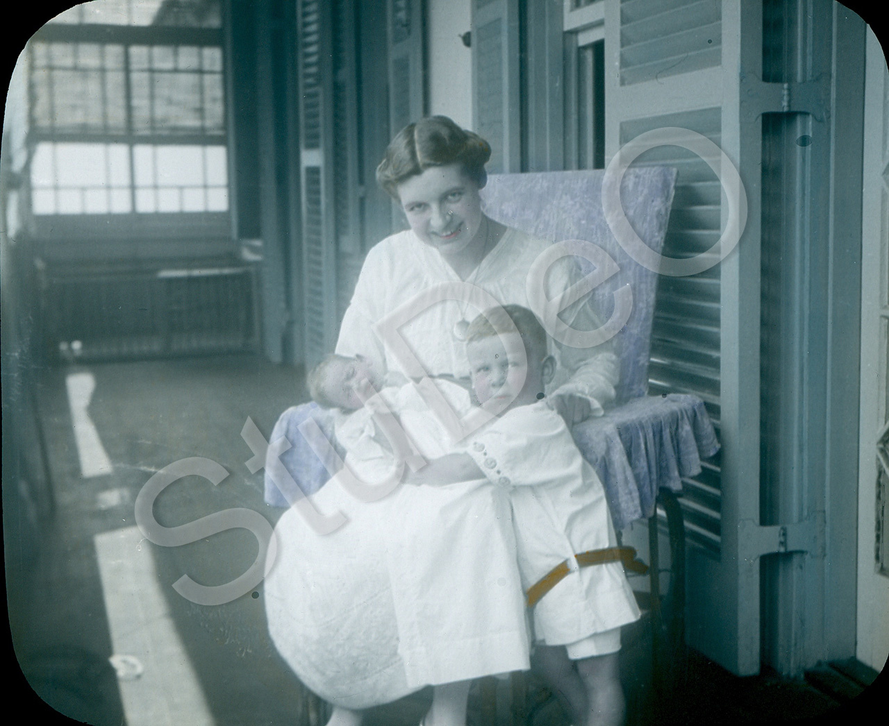 Beschreibung: Frau Koops mit Heidi (auf Schoß) und Klaus auf der Verander ihres Hauses in Kobe.