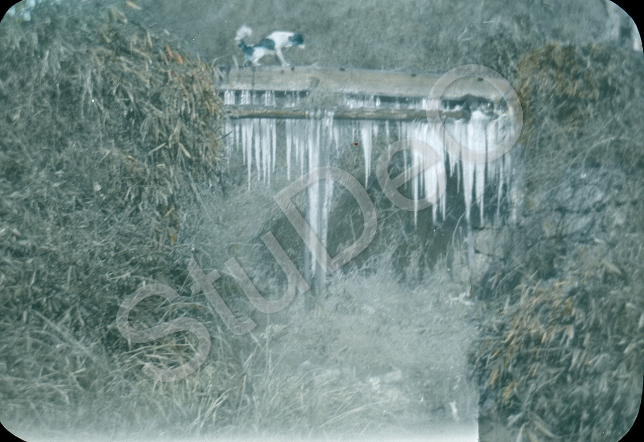 Beschreibung: Eine Baumstammbrücke mit herunterhängenden Eiszapfen. Ein Hund wagt sich darüber.