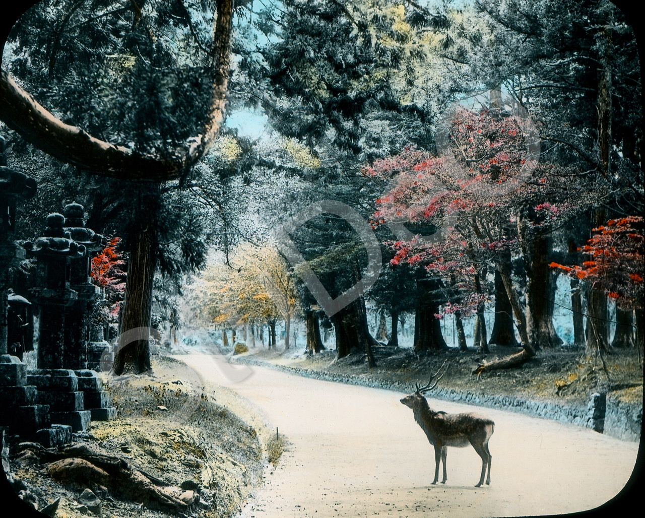 Beschreibung: Axeshirsch in Nara, die noch ältere Kaiserstadt. Reh, li. Friedhofsteine.
